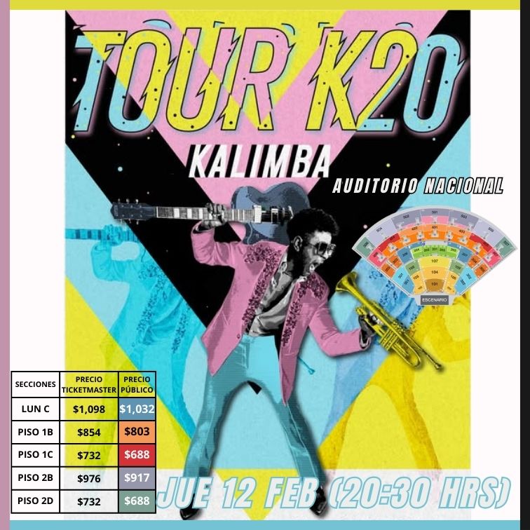 Kalimba celebra 20 años de carrera como solista, y no hay mejor forma de hacerlo que en el escenario del Auditorio Nacional. Este 2026 presentará su “Tour K20,” un recuento de su etapa solista con temas icónicos como “Tocando Fondo, Se Te Olvidó, Duele, No Me Quiero Enamorar, Estrellas Rotas…” entre muchos otros grandes éxitos, Kalimba es un artista multifacético con enorme fuerza escénica y sin duda una de las mejores voces de México. ¡No te lo puedes perder!